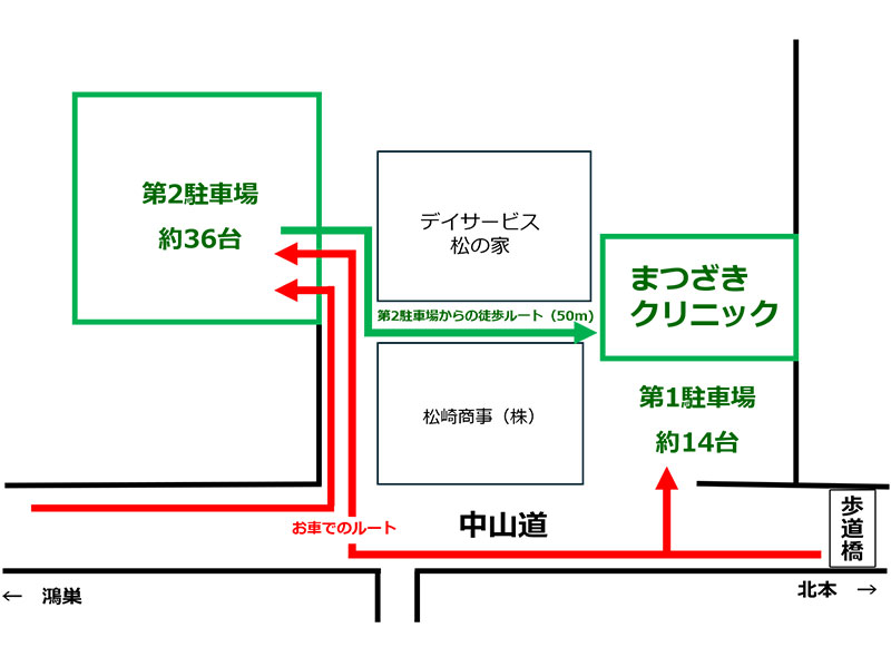 駐車場は、クリニック入り口前の第1駐車場(約14台)と、クリニック裏手の第2駐車場(約36台)をご利用ください。