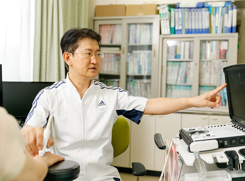 X線を使用せず筋肉や靭帯などを描出する体に優しい診断装置です。関節のケガの場合には患部を動かしながら評価できるところも特徴です。